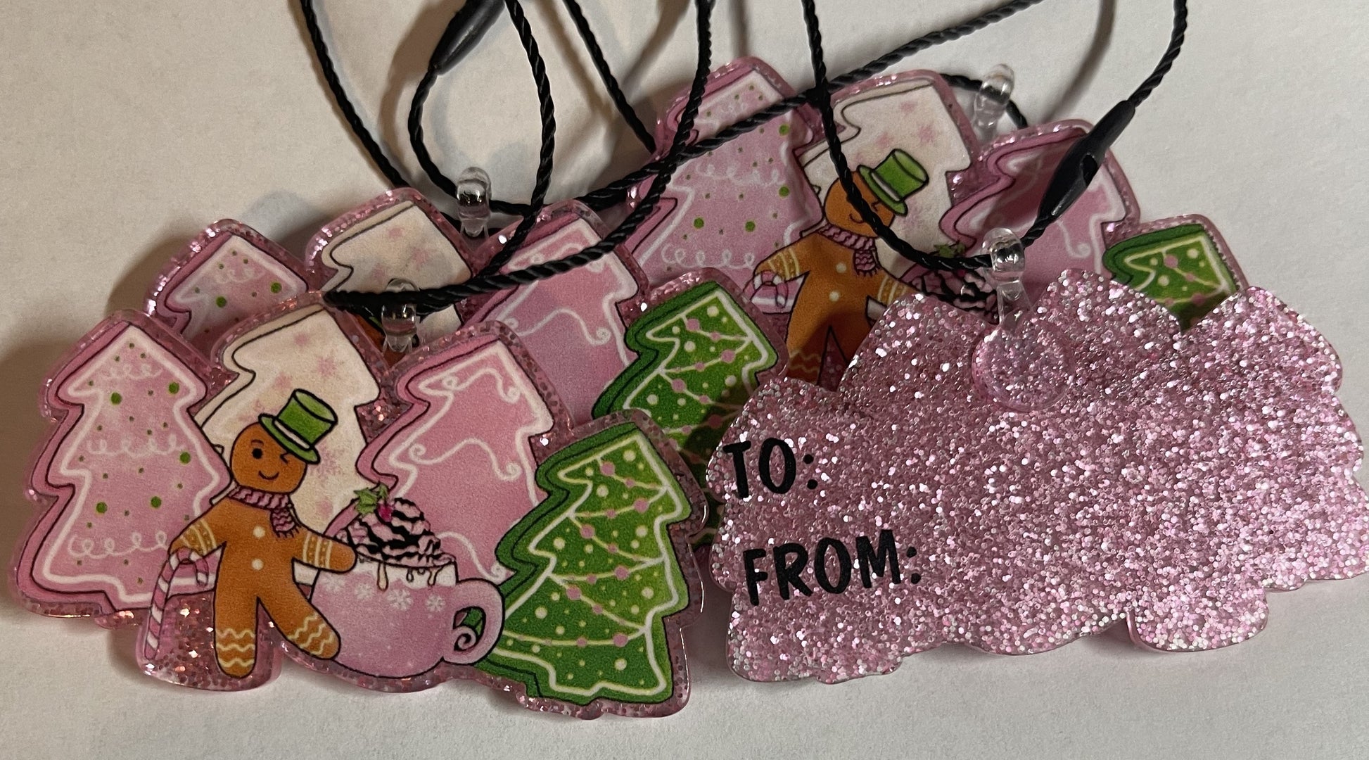 This set includes 5 gift tags, perfect for use as keepsake ornaments. These are acrylic and you can use a permanent marker to add names. If you would like to use them just as ornaments you can remove the vinyl TO: and FROM