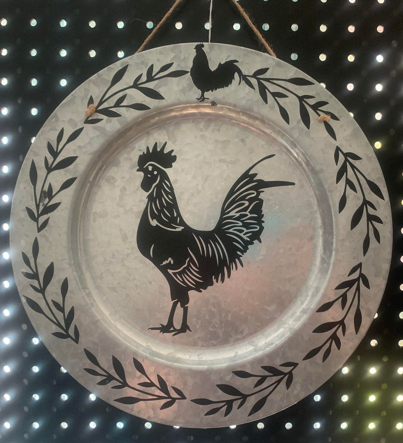 METAL CHARGER WITH ROOSTER IN CENTER AND SMALL ROOSTER AND VINES AROUND