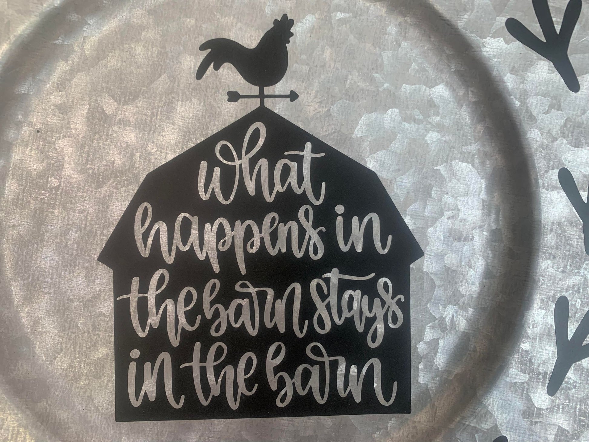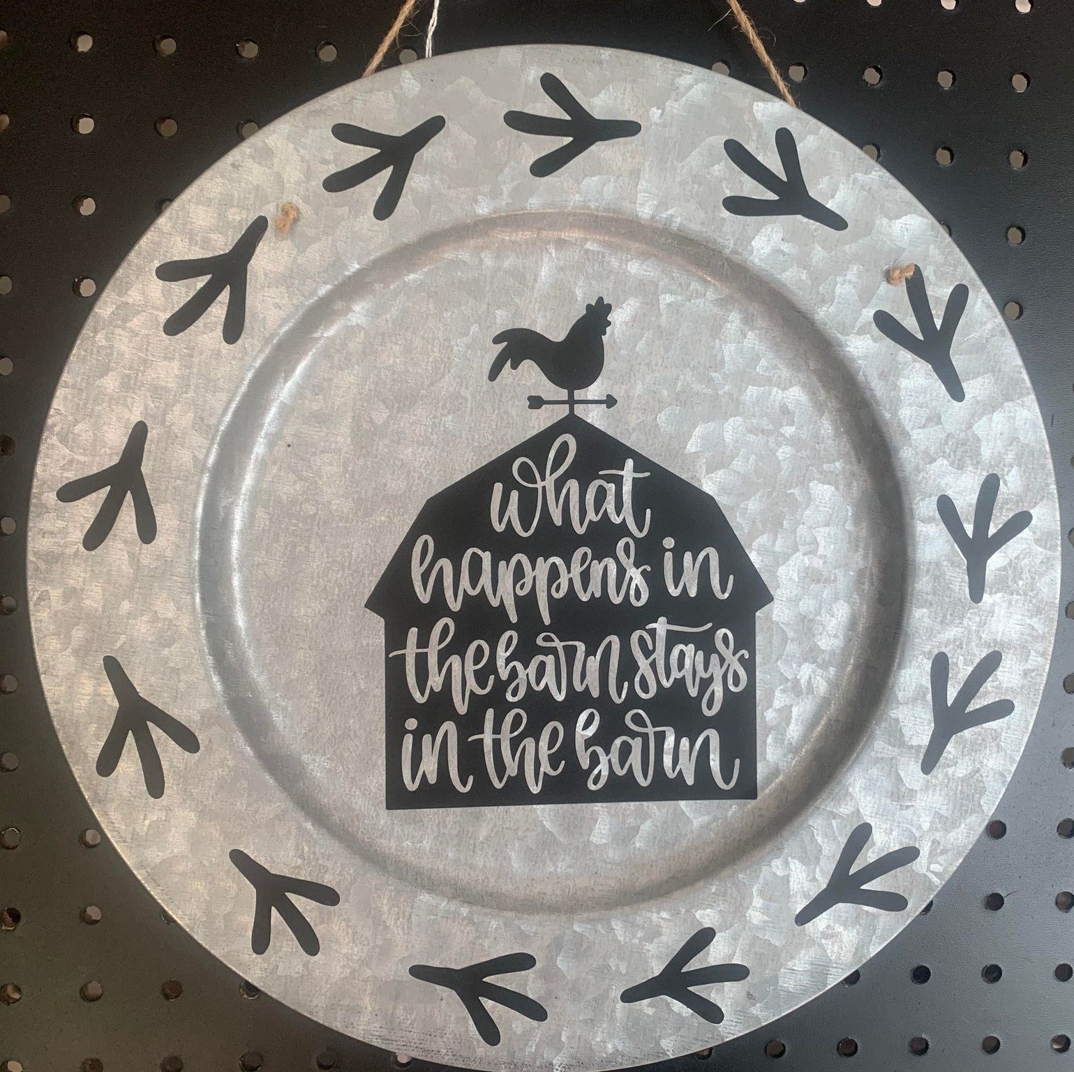 METAL CHARGER WITH WHAT HAPPENS IN THE BARN STAYS IN THE BARN