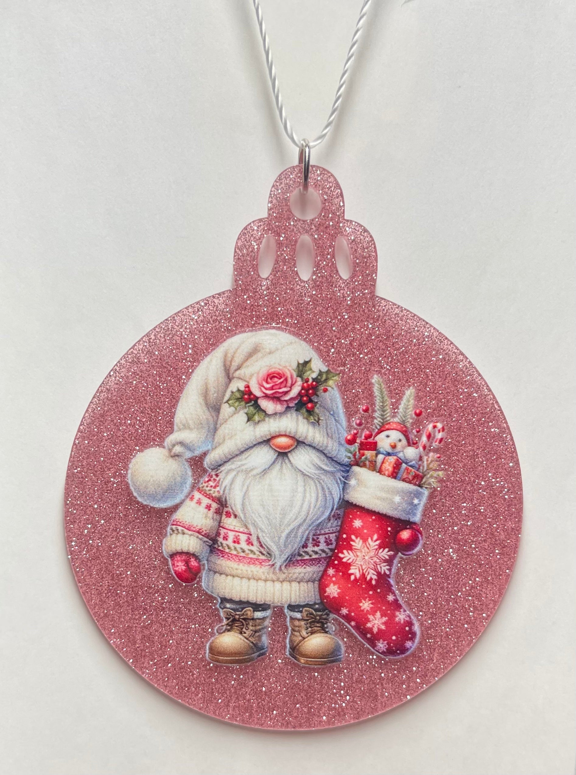 Durable acrylic material, the PINK CHRISTMAS GNOME ORNAMENT is a festive addition to any holiday decor. Its vibrant color and high-quality construction make it a charming and long-lasting ornament for your Christmas tree or as a fun decoration around the house.