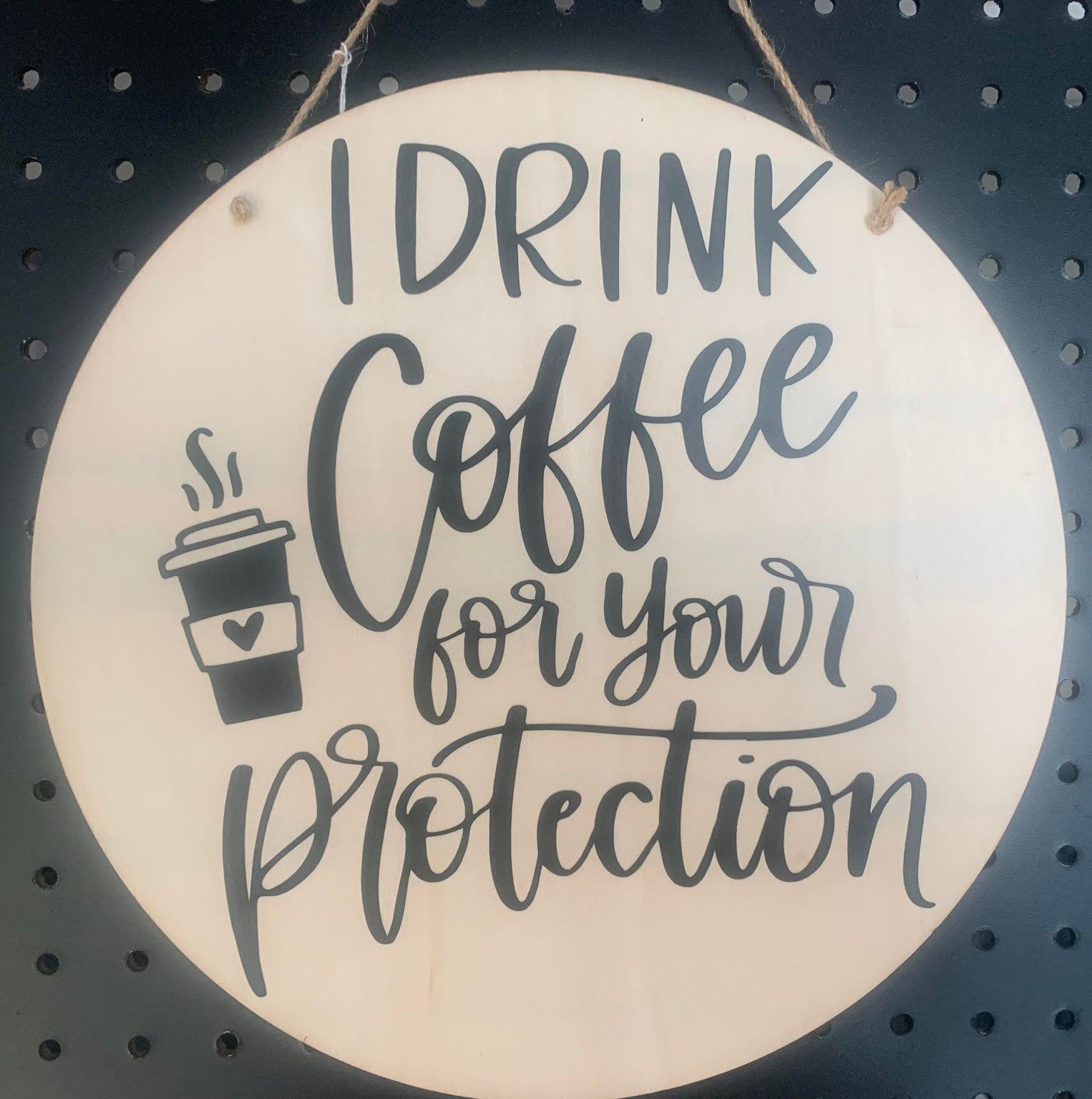 This round "Coffee for Your Protection" sign is crafted from light weight wood. It measures 12 inches in diameter and features bold black lettering on a natural background.