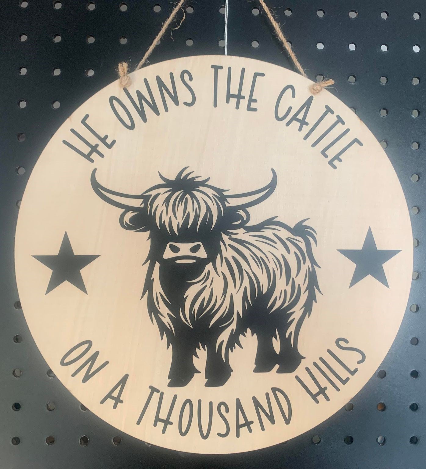 This ROUND HE OWNS THE CATTLE ON A THOUSAND HILLS WITH HIGHLAND COW SIGN is a beautiful, rustic-style sign featuring a Highland cow design. Made of light weight wood and vinyl. The sign will add a touch of character to any room and is perfect for exhibiting the love of nature and countryside.