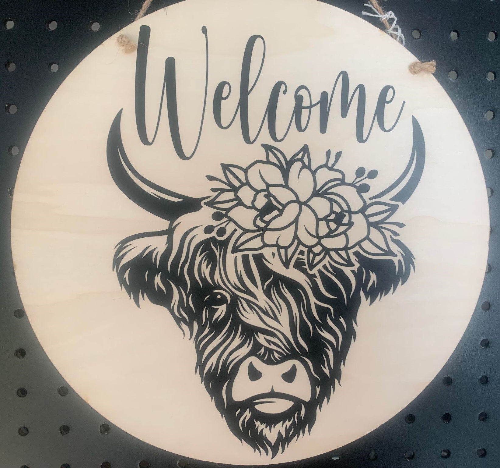 This ROUND HIGHLAND COW WELCOME SIGN is crafted from lightweight wood and comes with a vivid, high-quality print. The rustic-looking sign is the perfect way to welcome guests to your home with a touch of country charm.